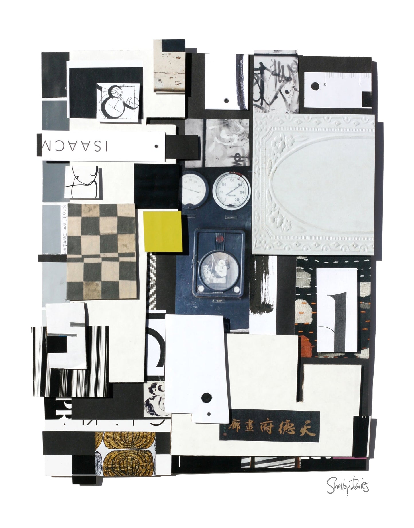 This collage begins with two ampersands, one of my favourite symbols in typography, which joins diverse things together in the most elegant of graphic ways. Measuring instruments, checkerboard patterns, houndstooth textiles, ink splodges, a carved Chinese sign, graffiti, a weathered window, shadows and a photocopied print of a favourite hand-stitched jacket all join together to make this black and white composition something to contemplate.
