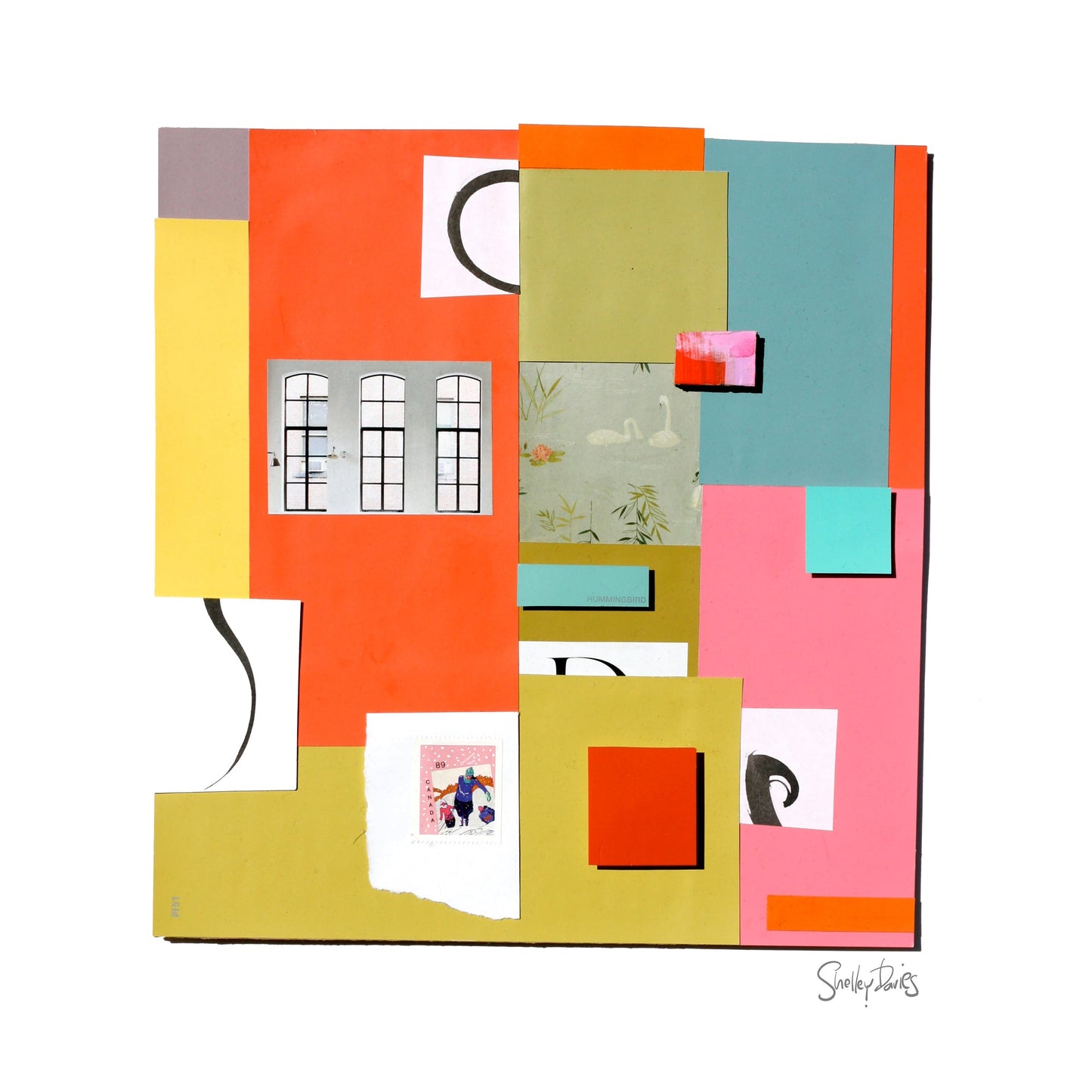 This mixed media collage is a 3-dimensional work, built up from paint chips, vintage hand-written letters, copies of textile fragments, scraps of brightly coloured paint palettes and black ink drawings. Shelley likes building up surfaces, starting with a cardboard structure, and then adding elements until they take on an architectural quality, giving the viewer a peek down a hidden corner of colour, a hallway of intrigue, typography, textiles and pattern to tell its story.