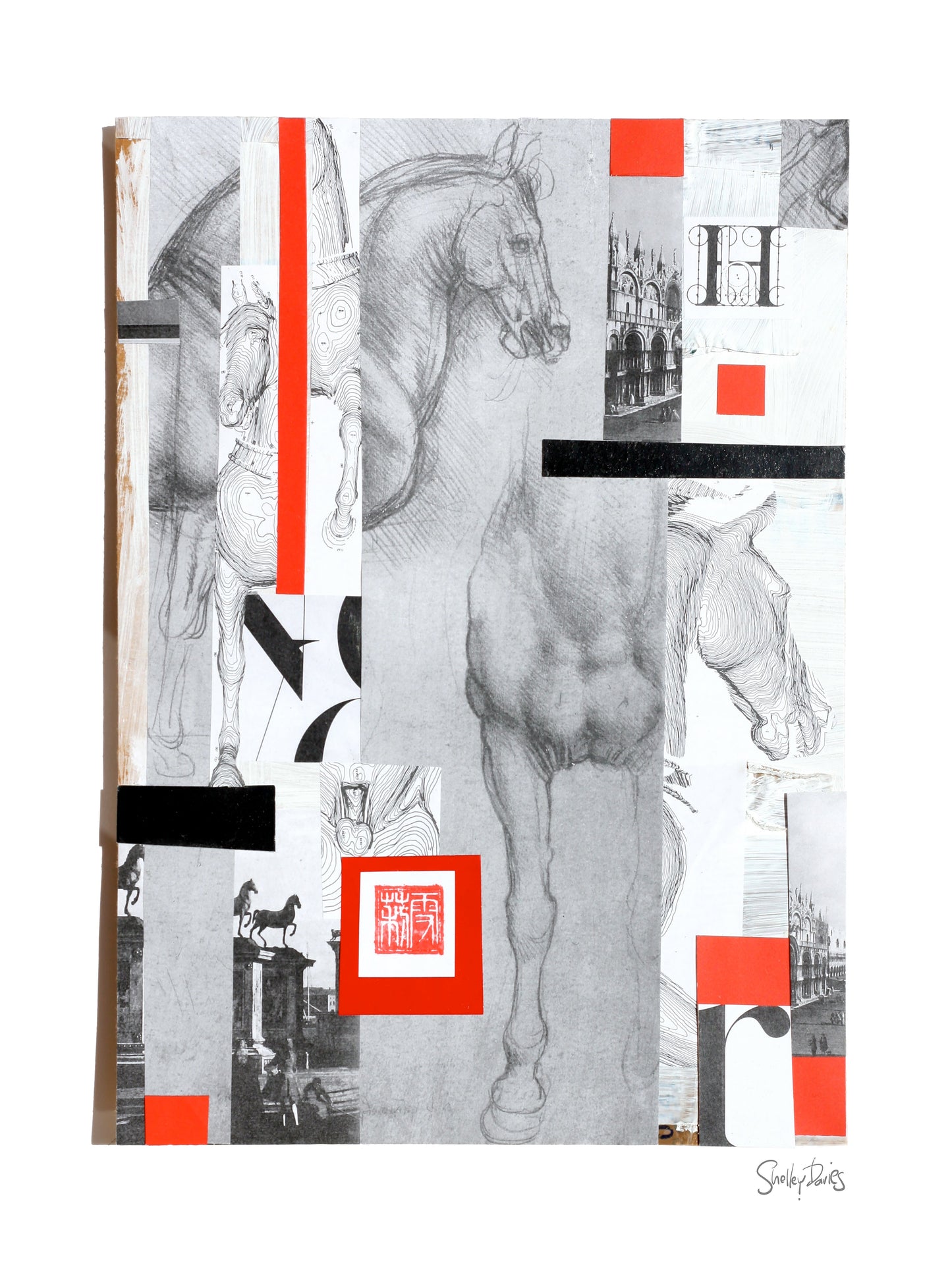The statues of the four horses in San Marco Square in Venice are the starting point for this collage. An isometric cross-section of these famous sculptures brings contemporary analysis to these ancient horses (which were plundered from Constantinople in 1204, brought to Venice, then plundered by Napoleon, and then returned yet again to Venice). The Roman 'H' and typographic details echo the architectural arches of San Marco, with slices of Leonardo da Vinci's magnificent horse drawings added to create this equine composition.